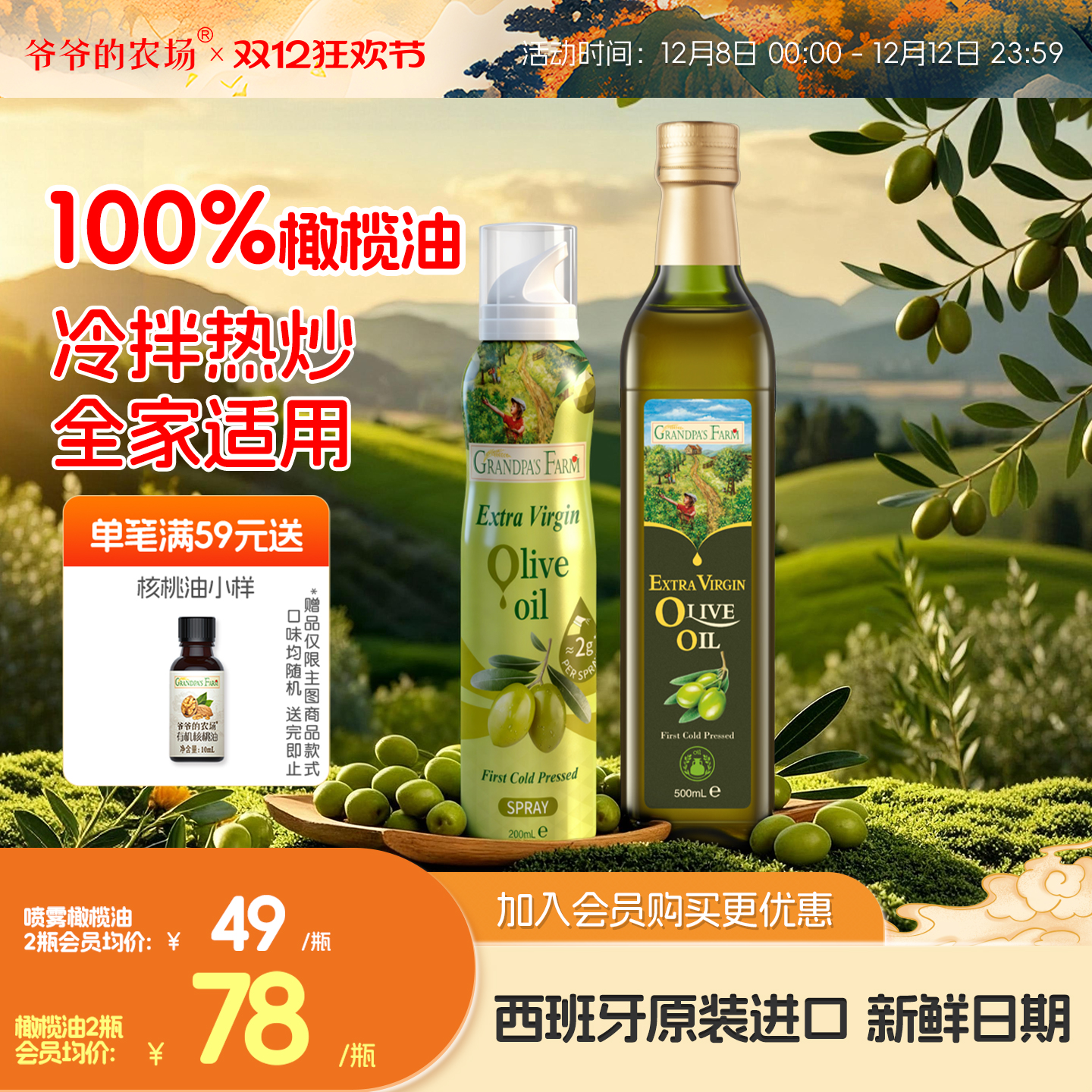 爷爷的农场特级初榨橄榄油100%原装进口热炒油送婴幼儿核桃辅食谱