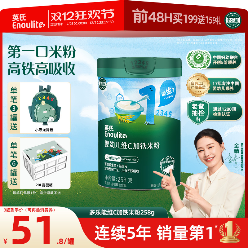 英氏维C加铁米粉 婴儿辅食宝宝营养高铁米粉米糊1阶 罐装原味258g