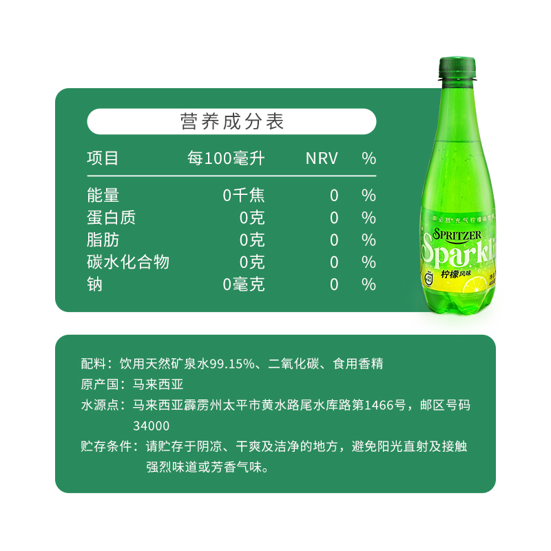 spritzer事必胜气泡水无糖充气矿泉水马来西亚森林水400ml*6瓶装