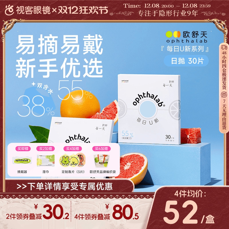 ophthalab欧舒天每日U新透明片隐形眼镜日抛30双含水